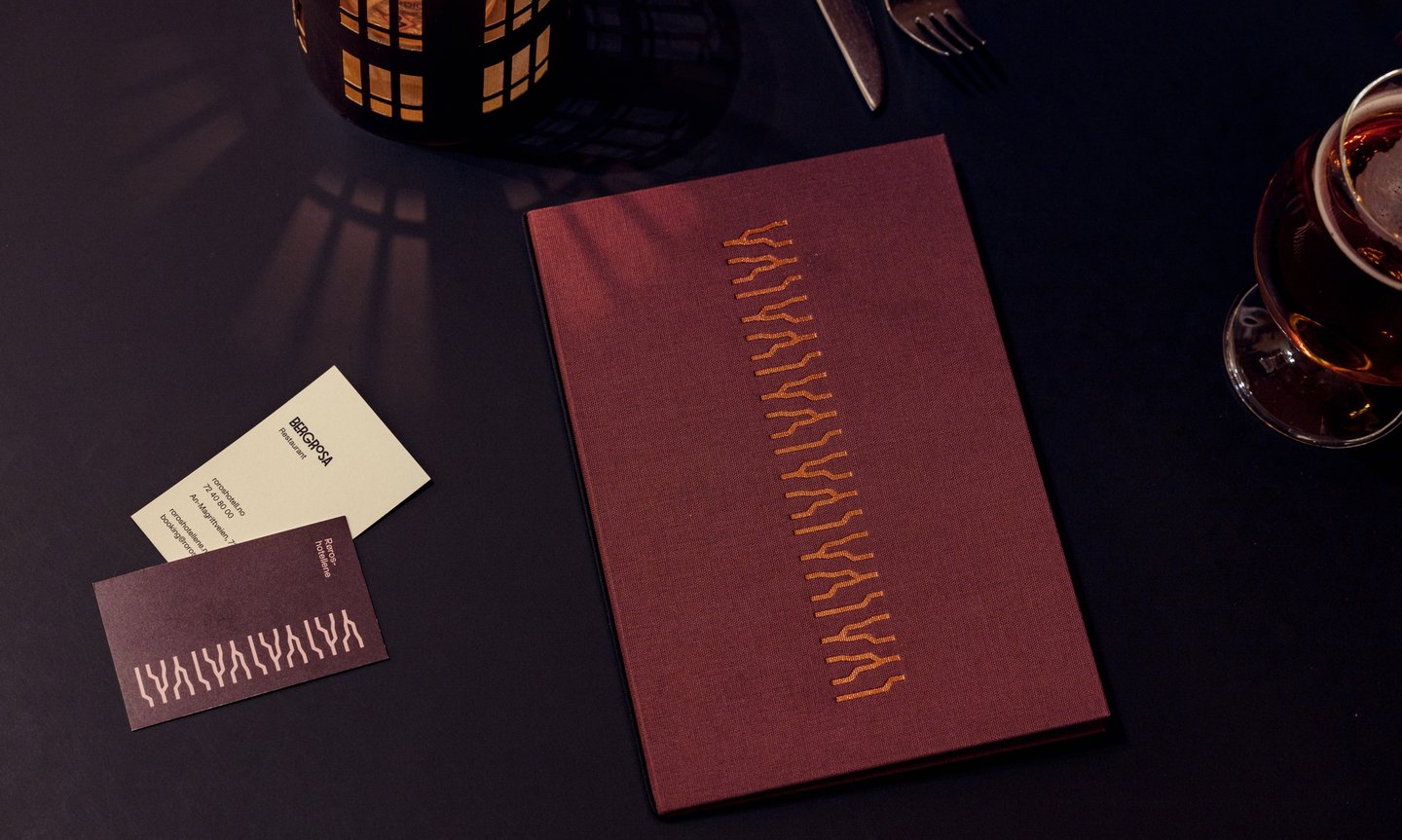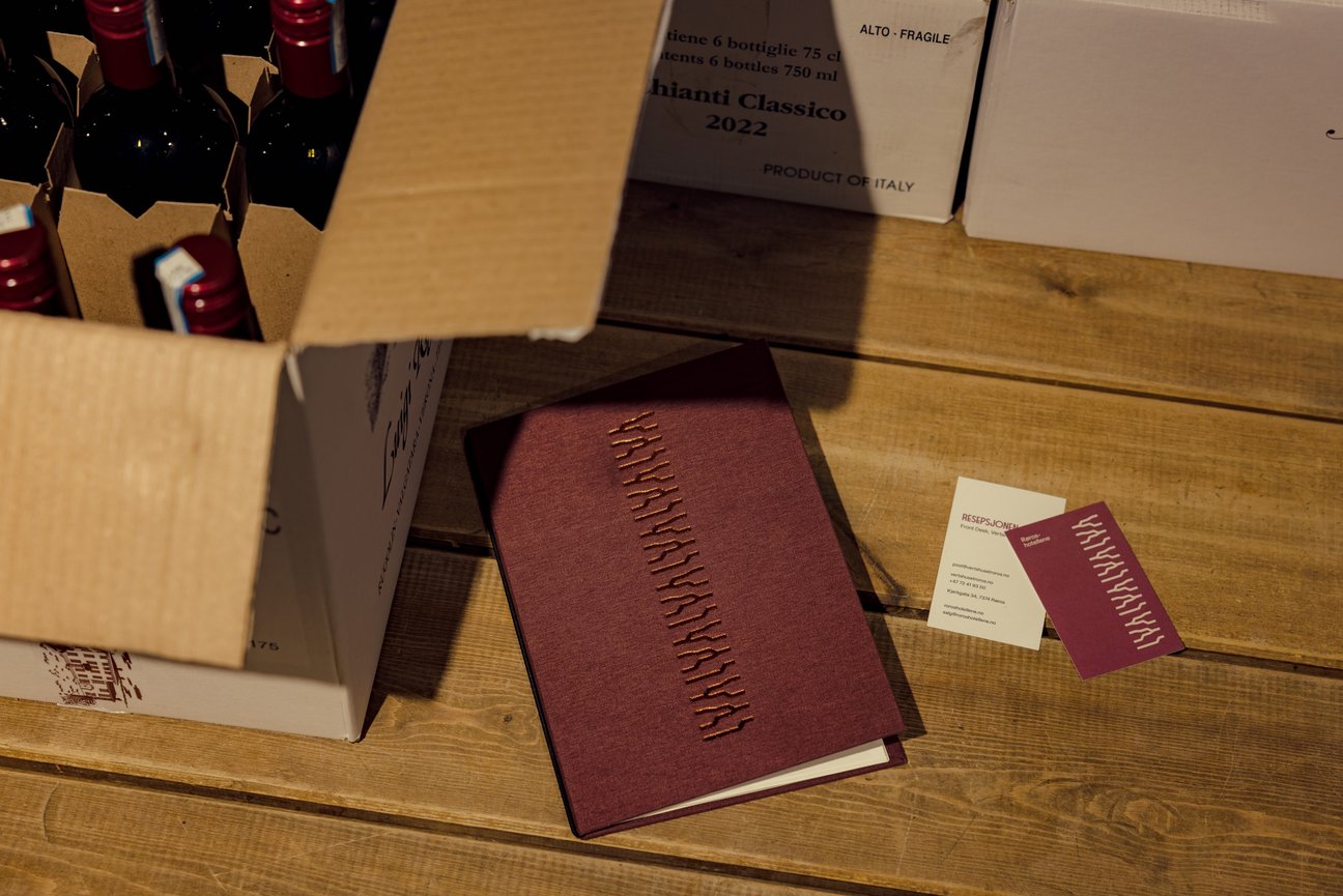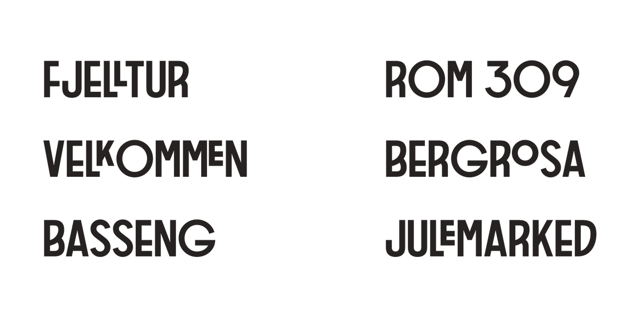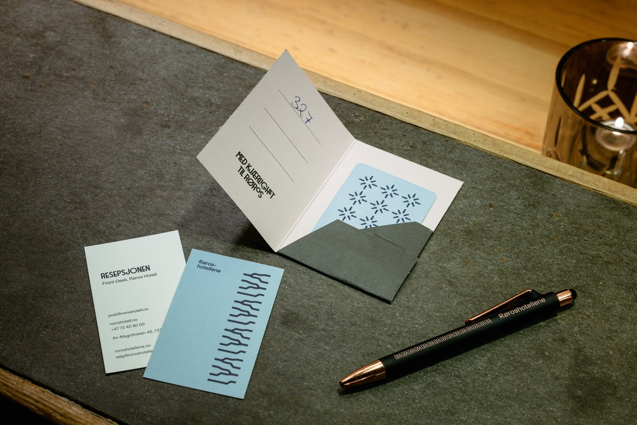 Vi har samarbeidet med Arve Båtevik fra Store Norske Skriftkompani og utviklet Støp Sans. Støp er en videreutvikling av en skrift som er brukt på veggen på Brødrene Krogs Uldvarefabrik, en av Røroshotellenes eiendommer. Skriften er samtidig inspirert av skrifttyper vi finner igjen i byens opprinnelige veifinningssystemer fra en tid hvor støping av skrift var en utbredt ferdiggjøringsmetodikk. Fonten er designet som om bokstavene er støpt i kobber, og den reflekterer hotellgruppens sterke forankring i Røros’ rike kulturarv.