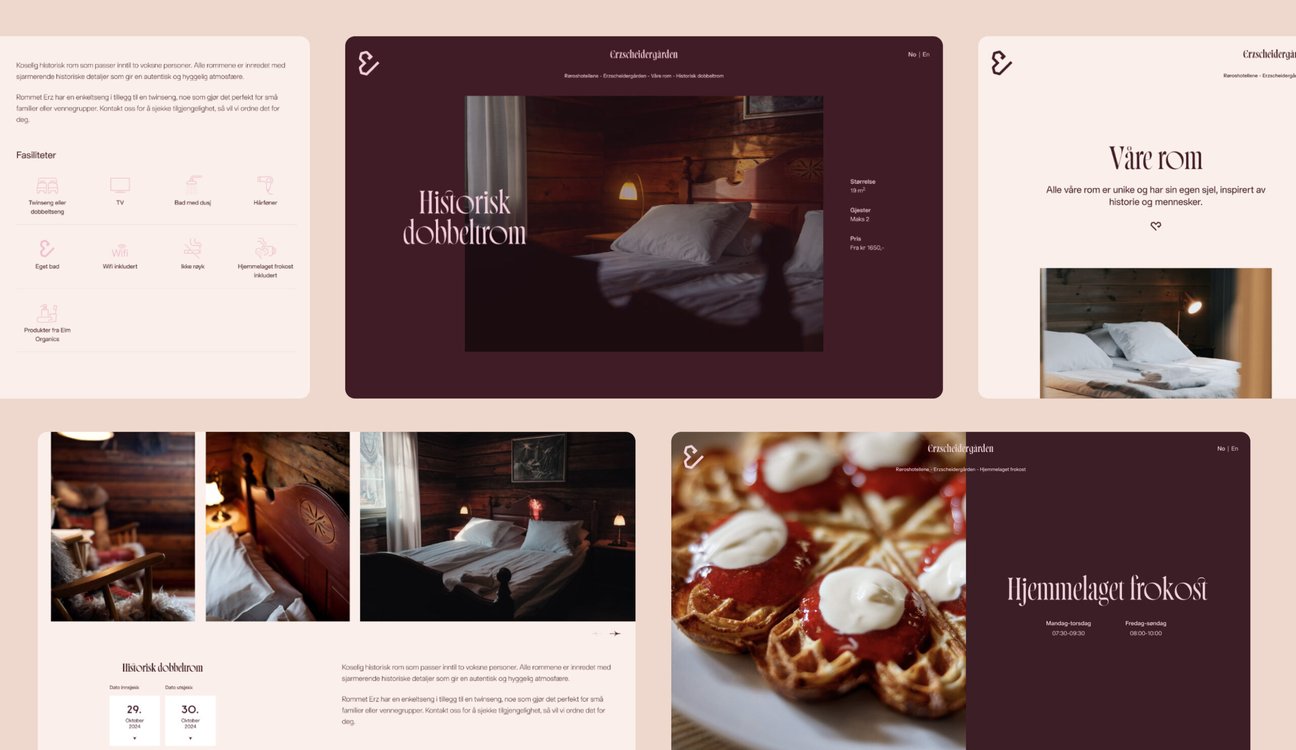 Erzscheidergården er et lite og rustikt hotell hvor alle de 24 rommene er unike. Som gjest eksponeres man for bruksgjenstander, møbler og fortidas tømmervegger som har kommet til heder og verdighet igjen, kombinert med moderne løsninger. Likevel er Erzscheidergården kanskje mest kjent for sin hjemmelagede frokost med lun atmosfære. Tjukkmjølksvafler med rørte bær og ekte Rørosrømme serveres hver eneste dag og har blitt et av stedets kjennetegn. Logoen likner derfor et støpt vaffelhjerte og danner samtidig bokstaven E.