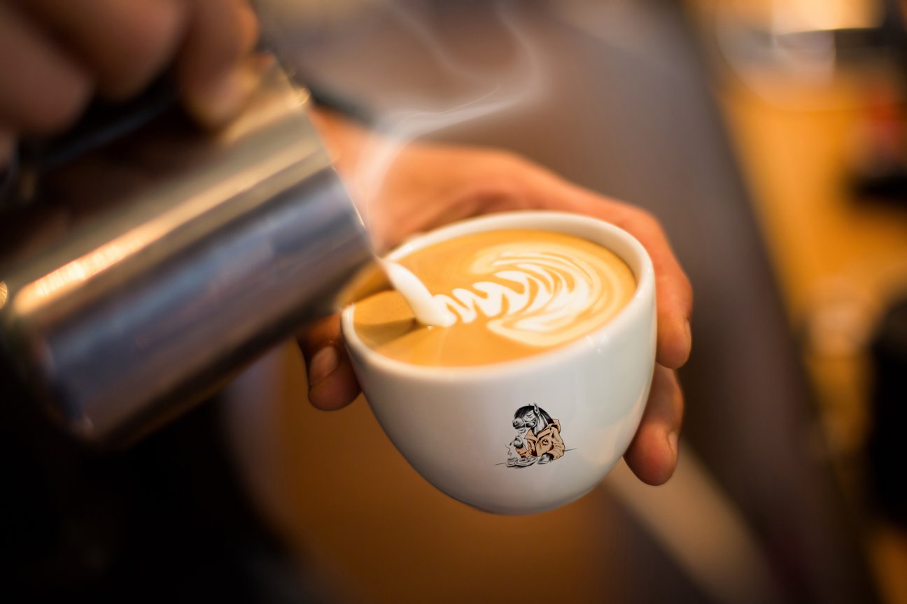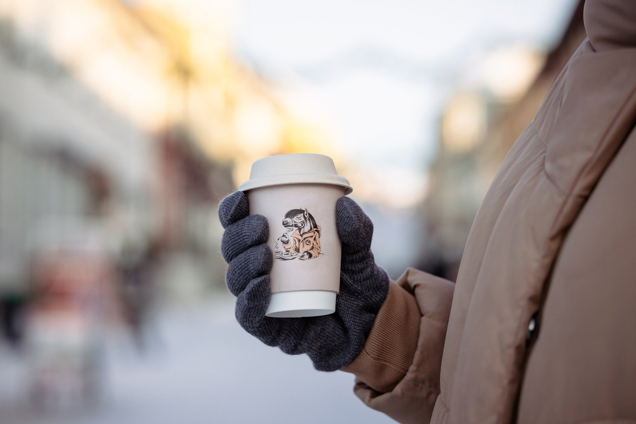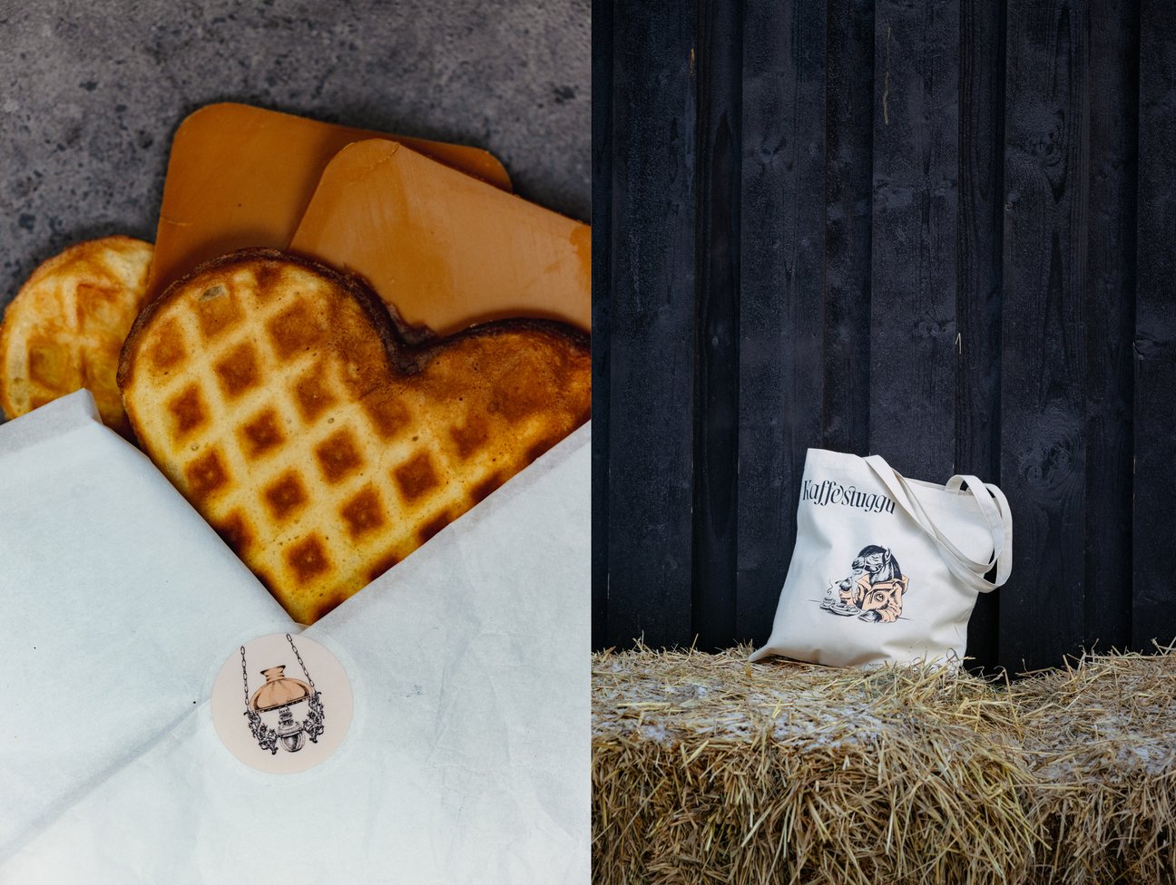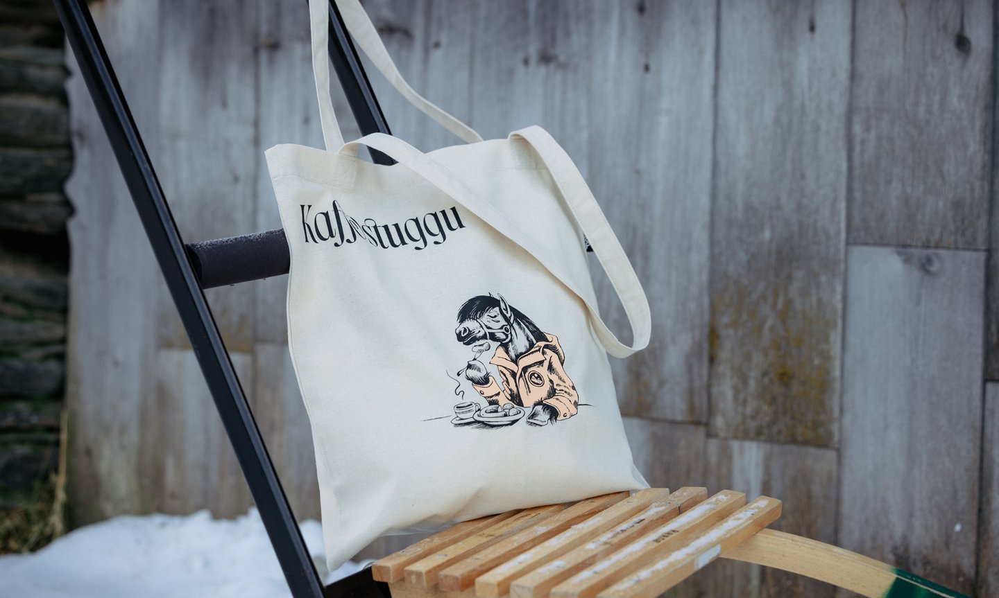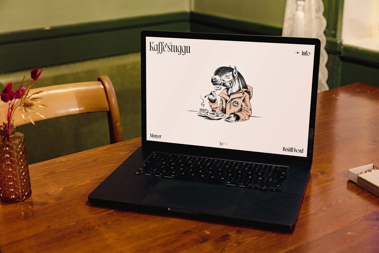 Vi ønsket å utforme en profilbærende illustrasjon som kunne supplere logoen og kommunisere den uformelle atmosfæren det er å være gjest hos Kaffestuggu. Løsningen ble derfor en dølahest med menneskelige trekk som nyter en kopp kaffe og signaturretten «surpølse» – en slags stereotyp Rørosinger flest nok kjenner seg igjen i. Hestens ikoniske ekspedisjonsjakke er også et uformelt og kjent syn ute i bybyildet som gjerne holder –20 kalde i vinterhalvåret, og 10 varmegrader og alle værfenomen i sommerhalvåret.