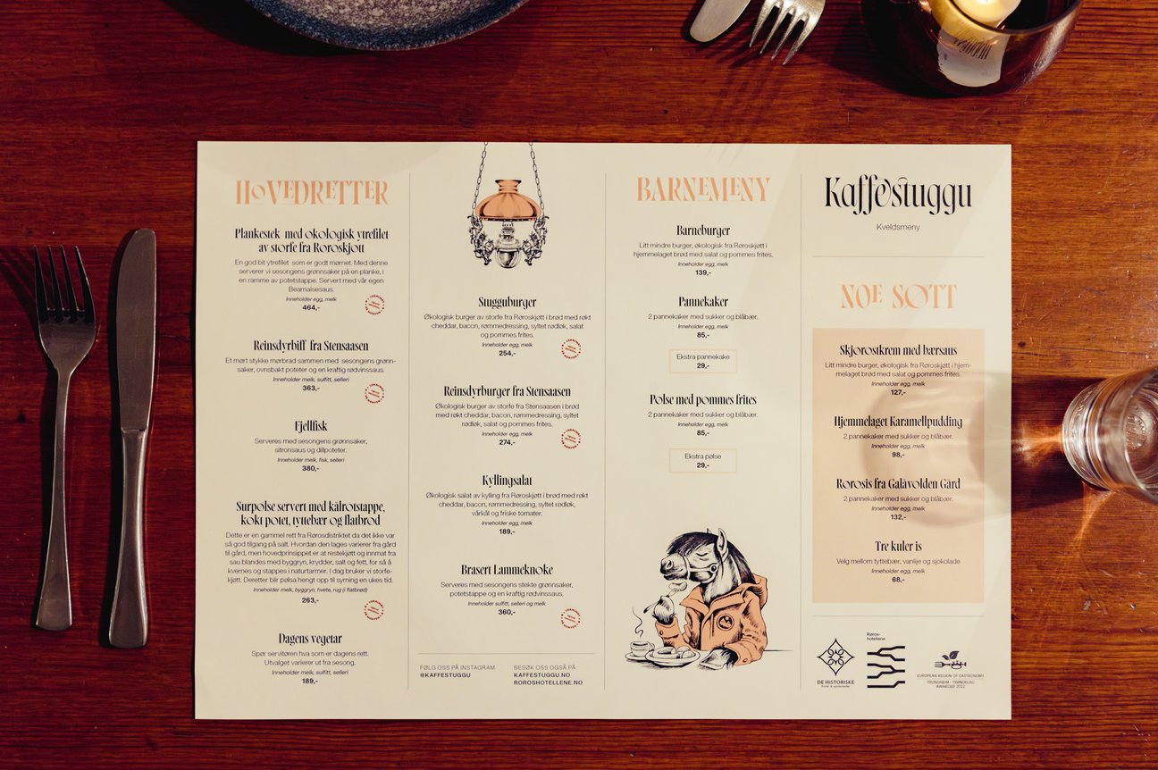 Absolutt alle på Røros kjenner Kaffestuggu og dens historie – en tradisjonsrik og viktig del av byens identitet. Den nye profilen er en visuell modernisering som samtidig kommuniserer over 100 år med historie og bevarer stedets sjel.