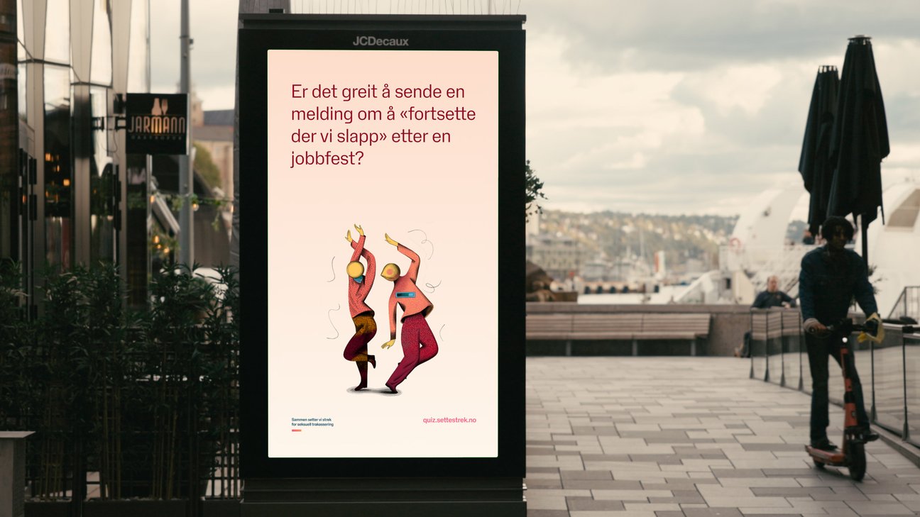 brudd i rutinene, eller ingen rutiner for seksuell trakassering i 55 prosent av tilfellene. Arbeidstilsynet, ombudet og partene i utelivsbransjen har gått sammen om kampanjen “Sette strek”, som vi har redesignet den visuelle profilen for.